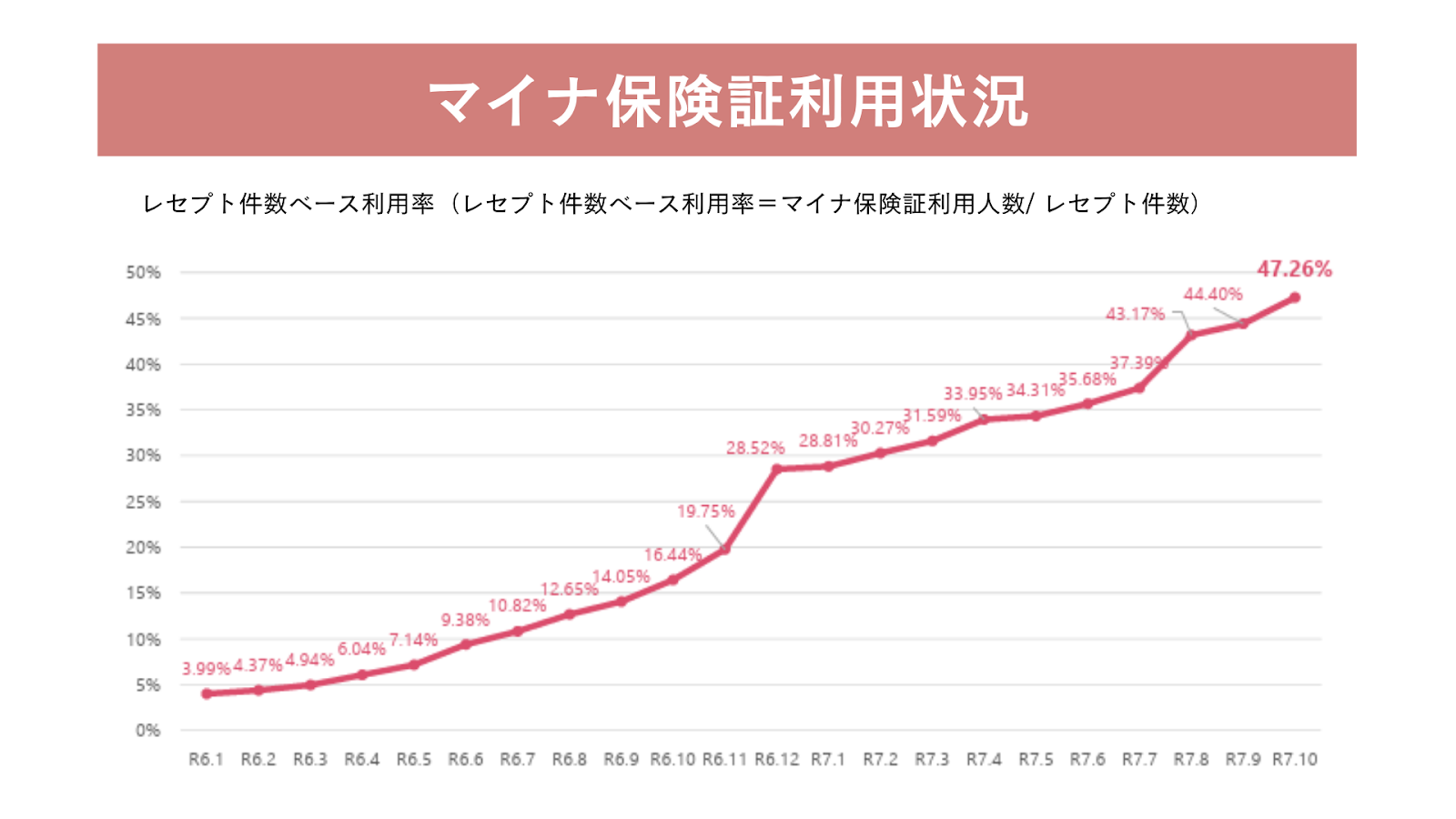 以下はマイナ保険証の利用状況を示しています。令和7年10月時点のレセプトベースの利用率は47.26%に達しています。有効期限を目前に使用率が右肩上がりであることがわかります。