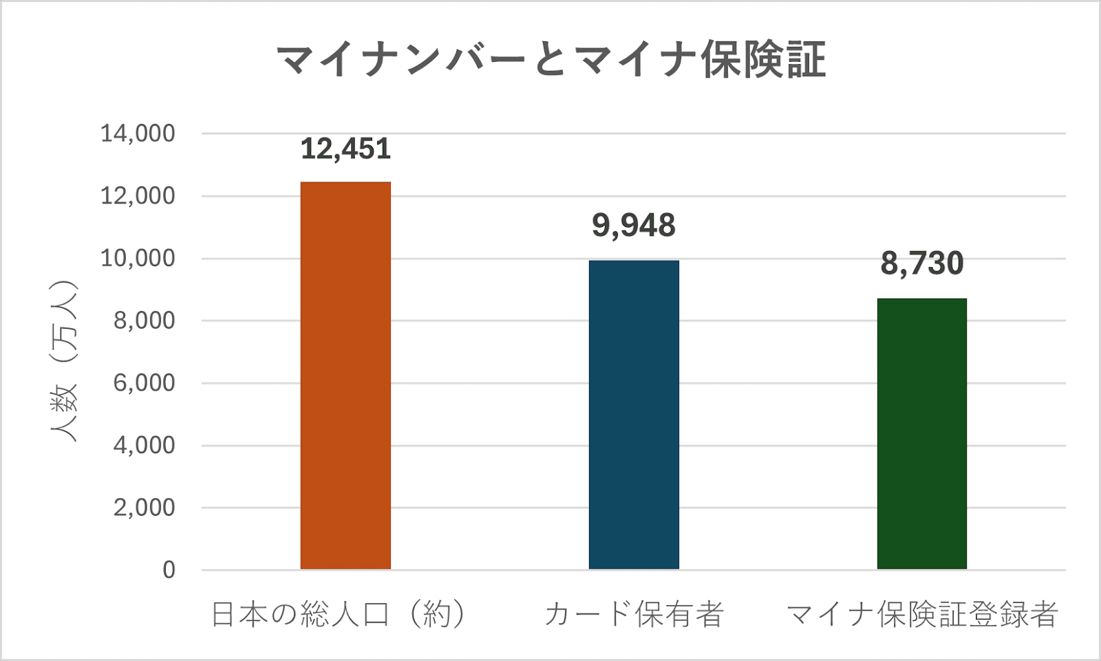 令和7年10月末時点でのマイナンバーカードの保有者数は9,948万人(全人口の79.9%)であり、うちマイナ保険証登録者は8,730万人(カード保有者の87.8%)。