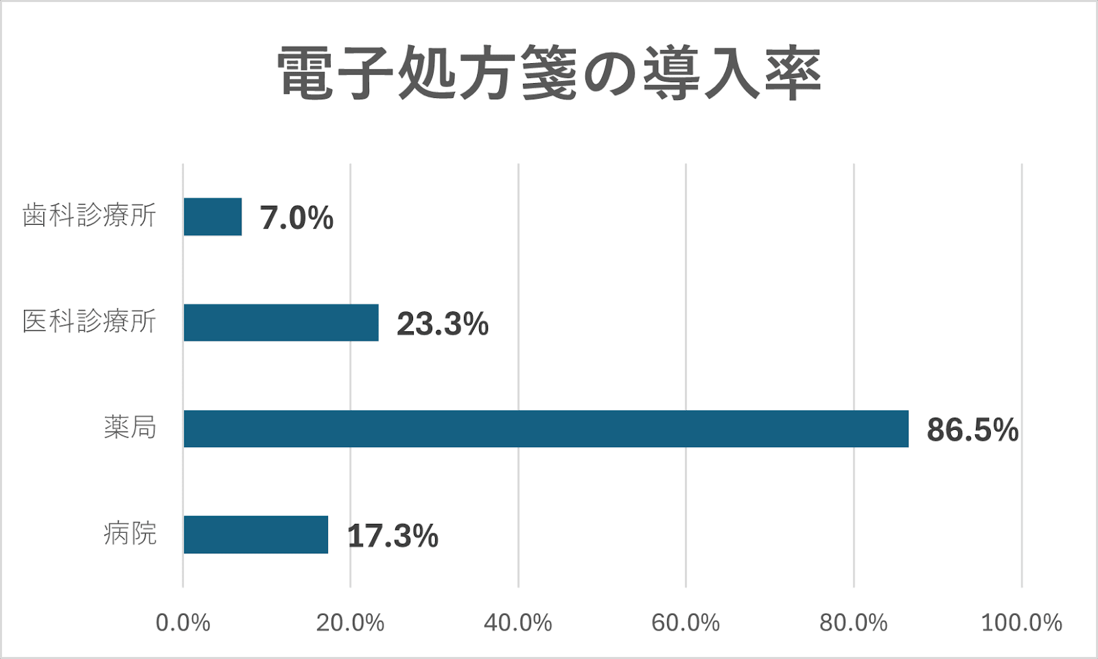 令和7年10月時点の導入率は全施設で36.5%です。薬局は86.5%と進む一方、病院は17.3%、医科診療所は23.3%にとどまっており、医療機関側の導入が遅れています。